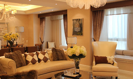 客厅地面铺装高级进口石材(伊丽莎白米黄、古堡灰、金镶玉、木纹石),双层波打线。墙面采用高级壁纸局部木饰面,客厅影背墙采用木饰面配合高级墙纸。天花板使用白色高级乳胶漆,层高3.4/3.6米,非毛坯后实得2.85米左右,四周采用轻钢龙骨吊顶。窗户采用断桥铝双层中空low-e玻璃窗,保温、隔热、防辐射。